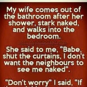 My wife comes out of the bathroom after her shower, stark naked, and walks into the bedroom. She said to me, “Babe, shut the curtains, I don’t…