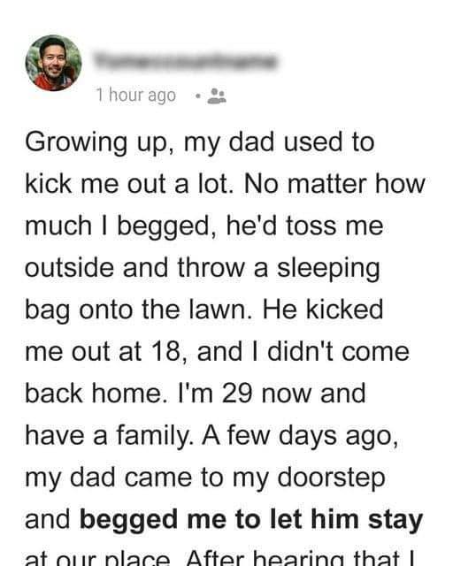 Unexpectedly, my father appeared at my doorstep, his eyes reflecting weariness and desperation. Memories clashed as he sought refuge, the man who once dismissed me now pleading for shelter. Faced with a choice, perpetuating rejection or extending compassion, I found empathy for his struggles.